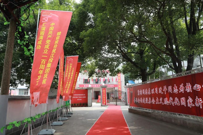 江投集团简介、萍矿集团发展历程、中国共产党人的精神谱系、江投集团党史学习教育巡礼展板,还有醒目的“红毯”、喜庆的踏步、大幅的标语、迎风招展的刀旗、猎猎飘扬的彩旗……从萍矿集团总部到剧院,一路精心布置的环境,让大家感受到扑面而来的喜庆气氛。