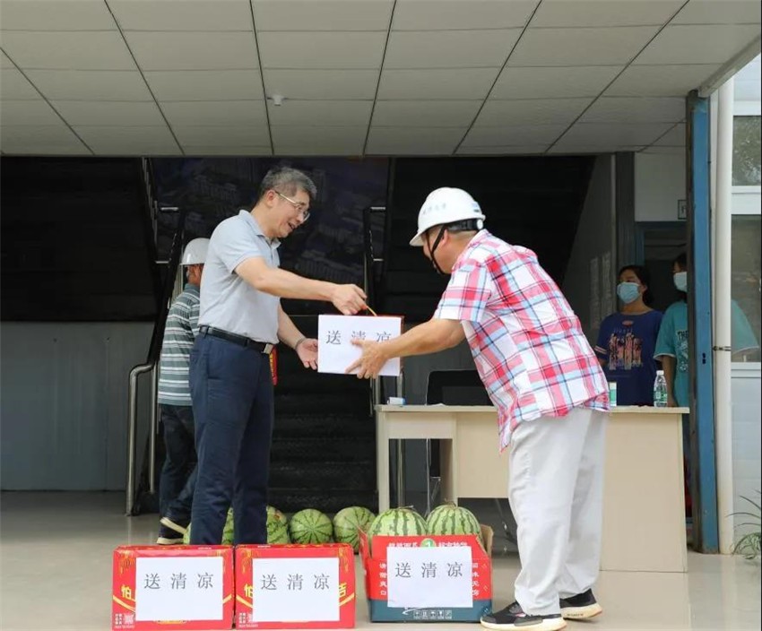 在项目工地现场,揭小健与坚守工地一线的员工们交流,为一线员工送上防暑降温物品,叮嘱随行人员一定要做好防暑工作,合理安排作业时间,确保职工健康安全。